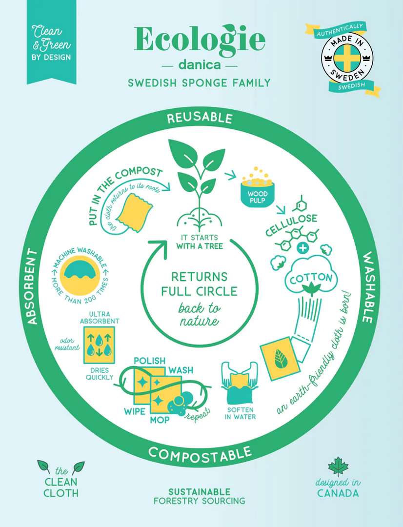Made from cotton and plant-based cellulose fibers, these compostable cloths are an established must-have in Scandinavia. They offer a sustainable alternative to sponges, dishcloths and paper towels and become soft and pliable when wet for easy clean-up.