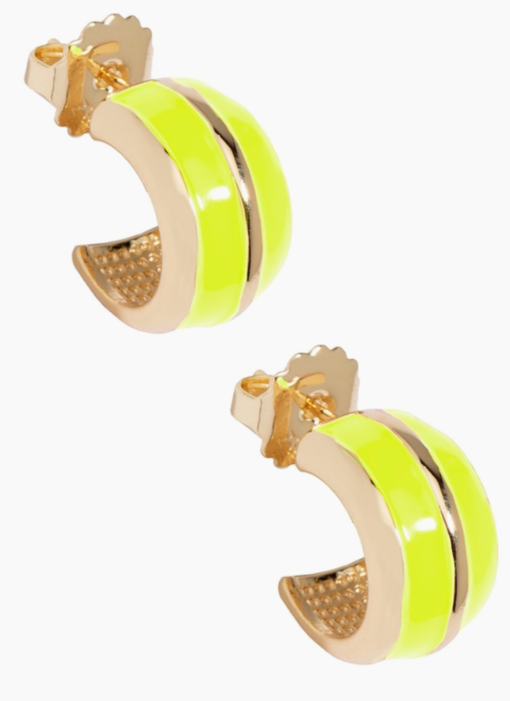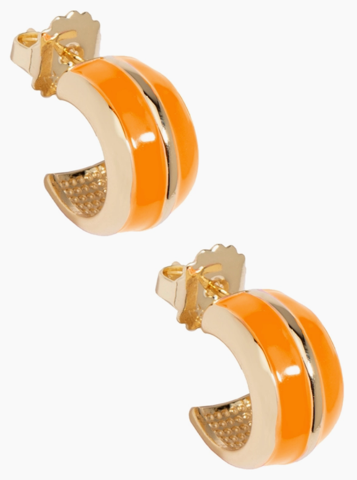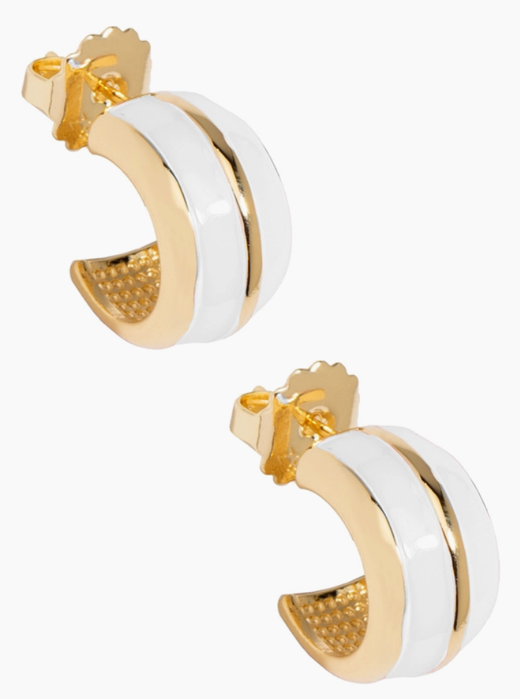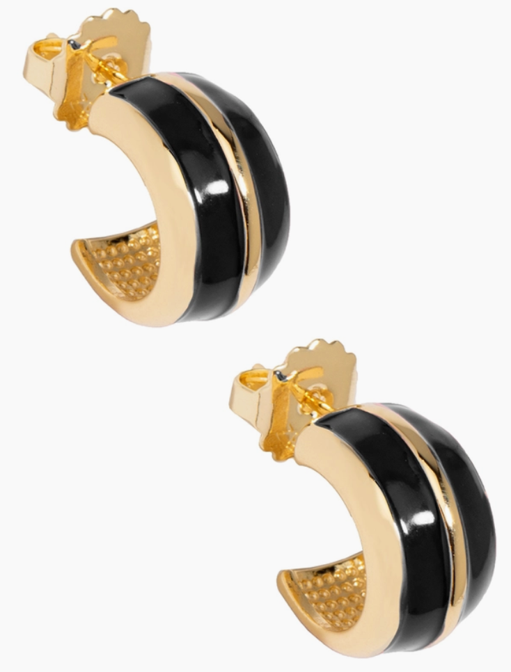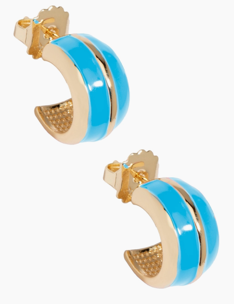 A colorful huggie earring with brass base and 18K gold plating finished with vertically divided enamel coating and post style back.