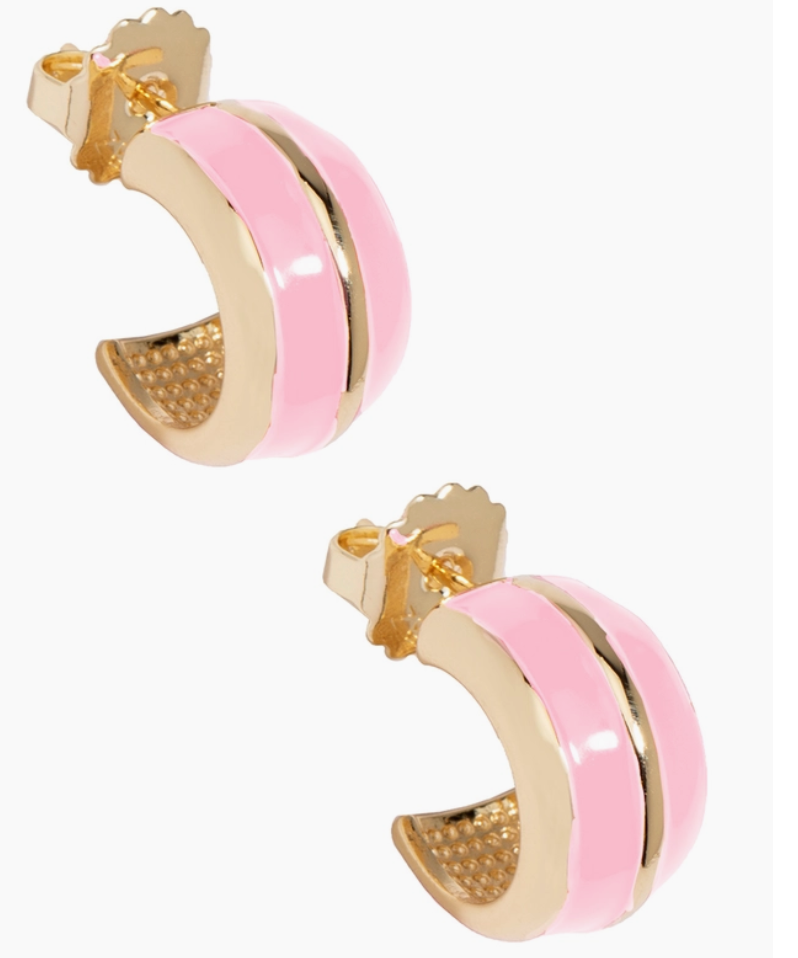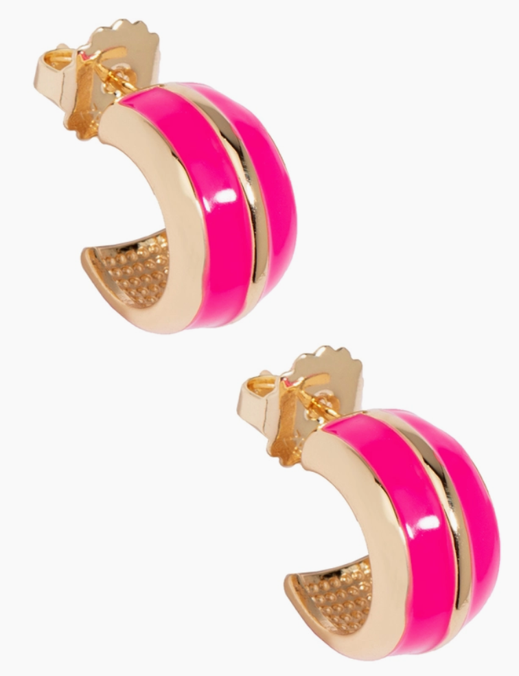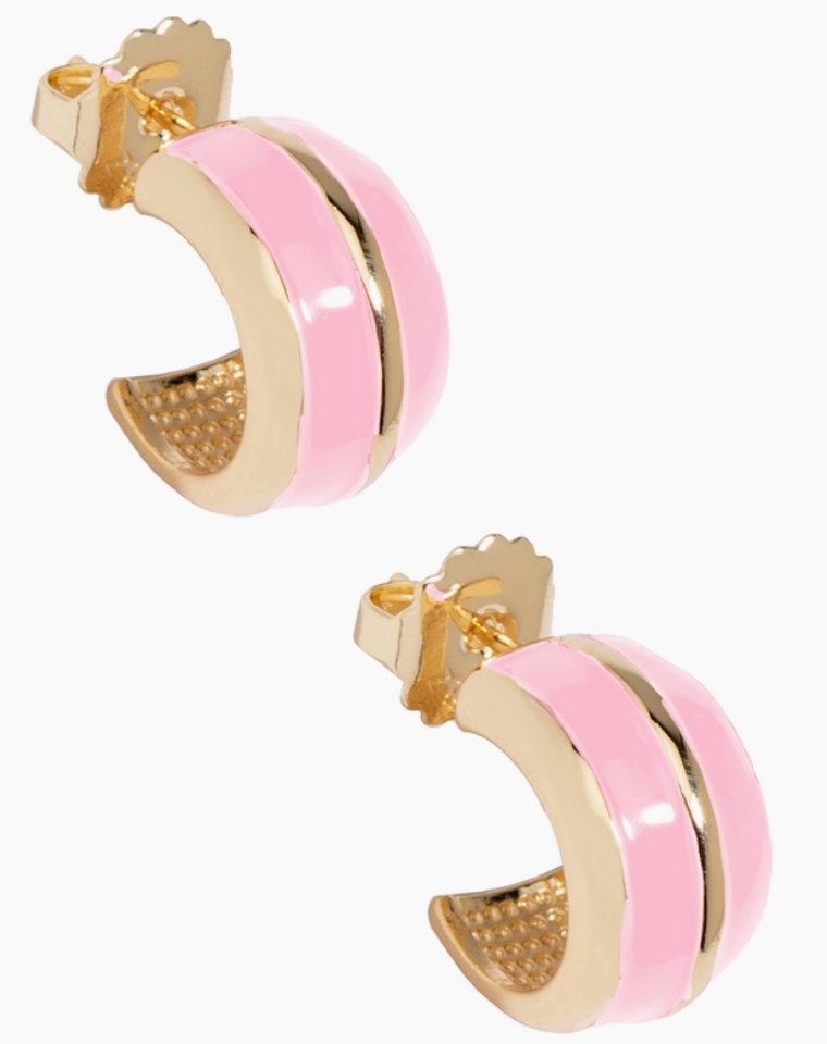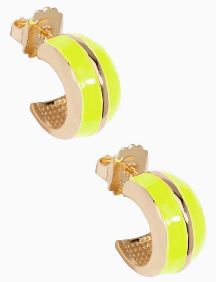 A colorful huggie earring with brass base and 18K gold plating finished with vertically divided enamel coating and post style back.