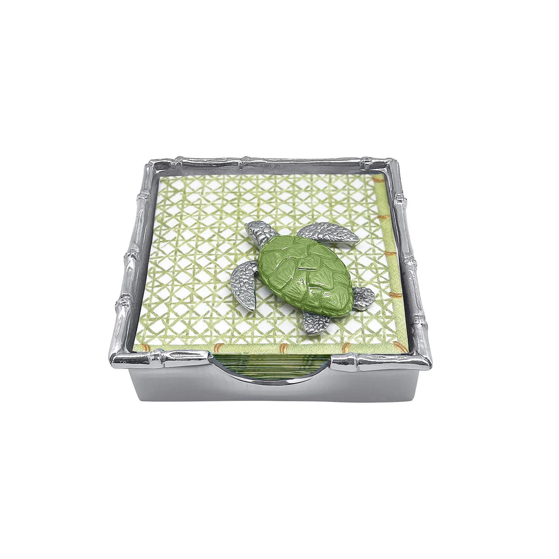Part of our Palmy Nights Collection, our 6" Bamboo Napkin Box is stacked high with festive green and white trellis napkins adorned with a must-have hand sculpted Green enameled Sea Turtle Napkin Weight. A punch of tropical color to your next cocktail party or tablescape! Handcrafted from 100% recycled, buffed-until-brilliant aluminum.