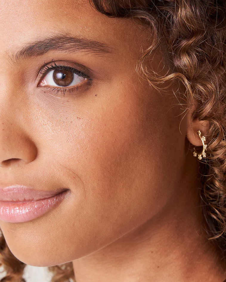 Our Hawthorn Midi Hoop Earrings capture that timeless look with small flowers around the hoop. Set in 18kt matte gold plating, you'll reach for these lightweight earrings over and over again.