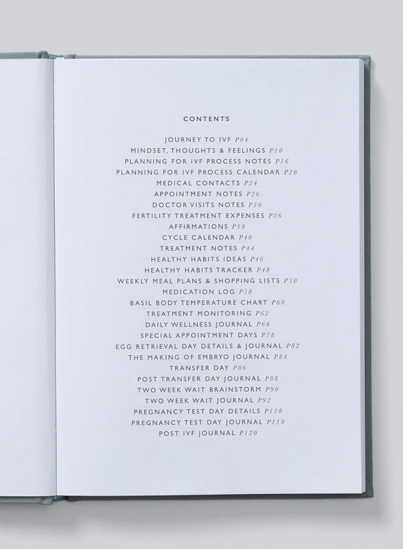 A planner, a confidant, a place to write your heart out while navigating IVF. Features calendars and pages to plan, appointments, treatment monitoring and journal sections including IVF journey, daily wellness, two week wait and post IVF. Positive quotes feature throughout to support and reassure the journey.