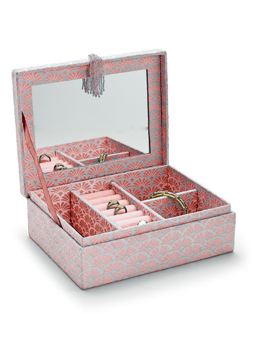 The perfect cozy home for your precious gems and baubles! With its playful printed fabric and adorable beaded tassel puller, this jewelry box is as cute as it is practical. So, whether you're storing your sparkly treasures or just adding a pop of color to your vanity, this jewelry box will keep your precious items close while adding a touch of whimsy to your space!