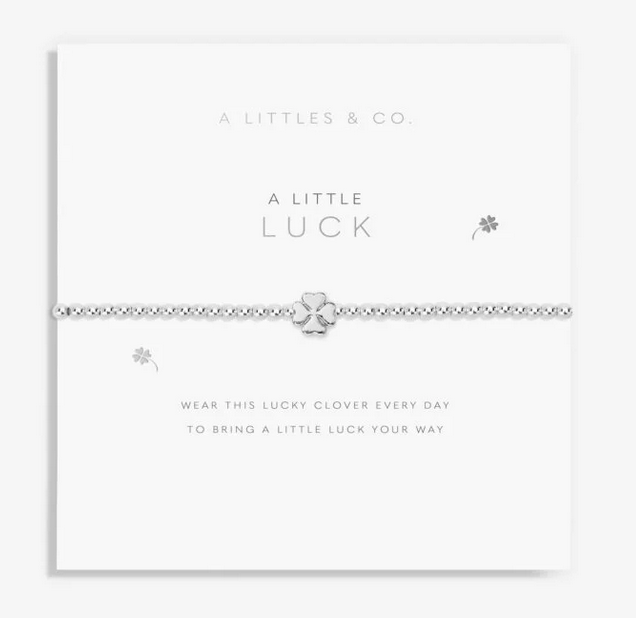 Our A Little 'Luck' Bracelet features a captivating design that will dazzle with every movement. Featuring a stretch-bead style and a beautiful silver-plated charm, wrapped around one of our stylized cards and framed by a sweet poem. It's oh-so special.
