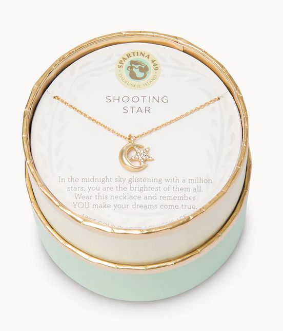 Wear our Shooting Star Necklace as a reminder to make your dreams come true. Featuring a moon star charm, this special piece comes packaged inside a beautiful box with the message: "In the midnight sky glistening with a million stars, you are the brightest of them all. Wear this necklace and remember YOU make your dreams come true."