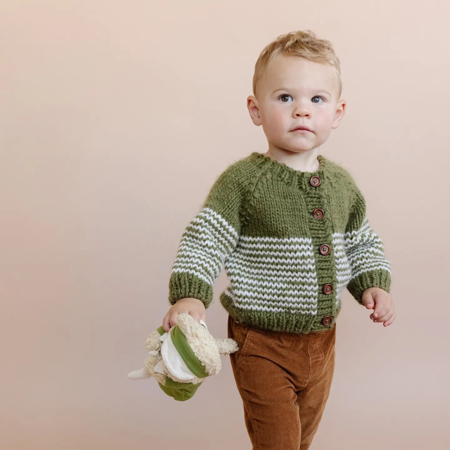 A classic stripe cardigan for Fall outfits through Holiday festivities. Match this Moss green sweater with Cream stripes and wooden buttons with a Classic pom hat and mittens.