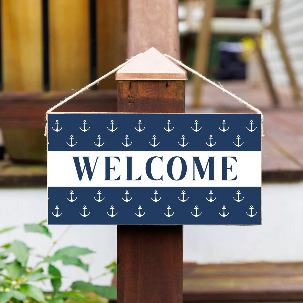 The Welcome Anchor Twine Hanging Sign in navy adds American charm to your front door, wall and home décor.